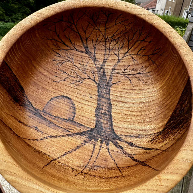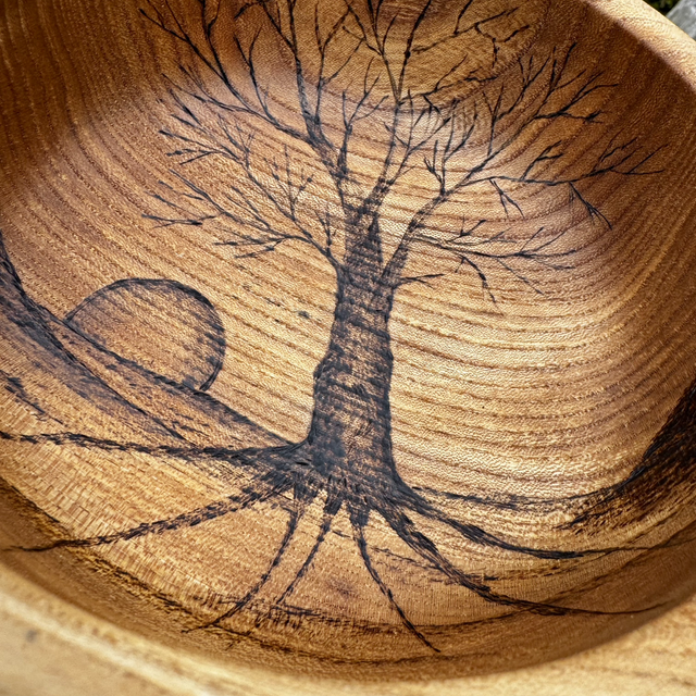 Hardwood wooden bowl featuring a pyrography nature inspired scene